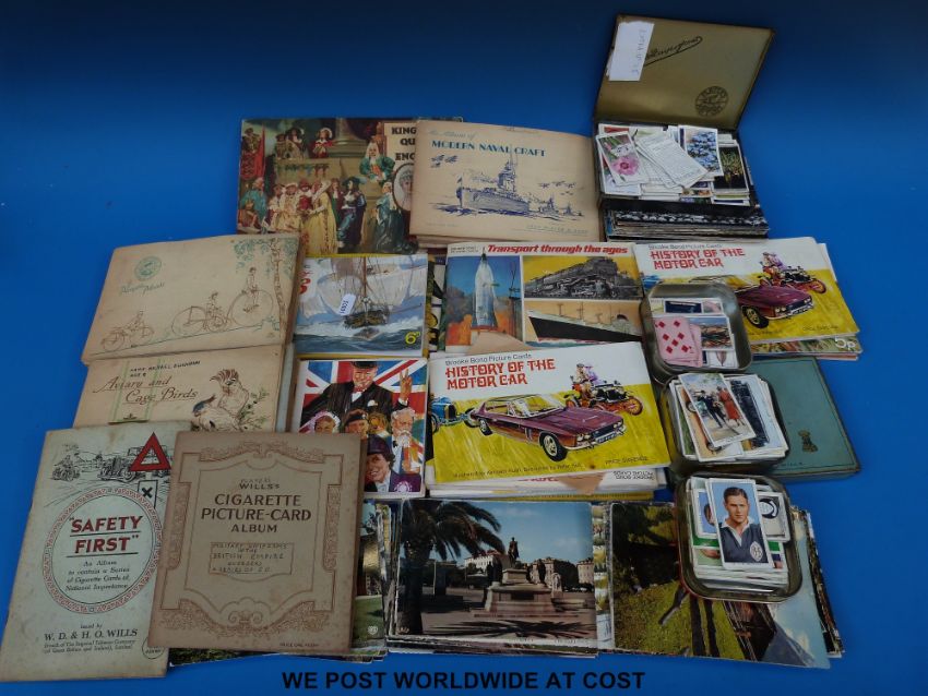 A collection of cigarette cards in albums and tins, including Player's, Wills and Gallaghers with subjects including motoring, cycling, aircraft c1930s, football etc, together with a quantity of tea cards etc