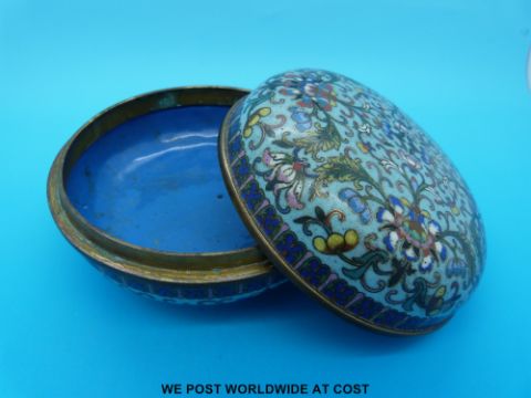 A Chinese Jiaqing period (1796-1820) cloisonné box of circular form, the domed cover brightly enamelled with floral sprays reserved on a turquoise ground (12cm diameter)
