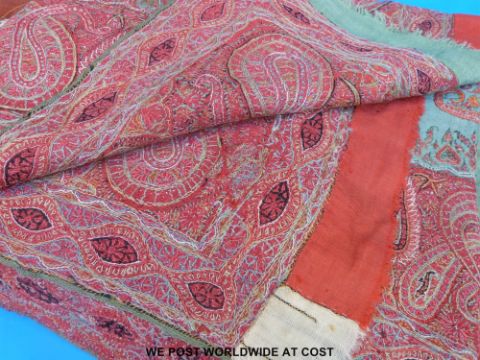 A paisley embroidered throw, probably 19thC and three further pieces of embroidery
