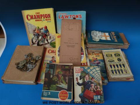 A collection of football-related ephemera and annuals including Champion, Playfair, Sexton Blake Library and some Royal Air Force issue maps together with some military badges. Most items 1940s/50s
