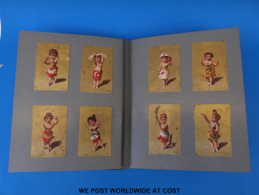 A late 19thC scrap album containing trade cards including many gilt examples, French, monkeys, alphabet etc