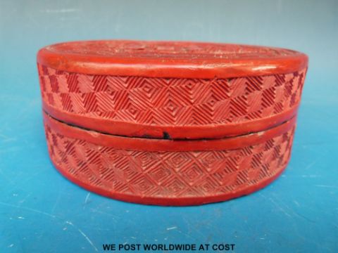 A Chinese circular cinnabar lacquer box with carved figural scene to top and carved geometric design to the sides (w14 x h5.5cm)