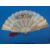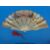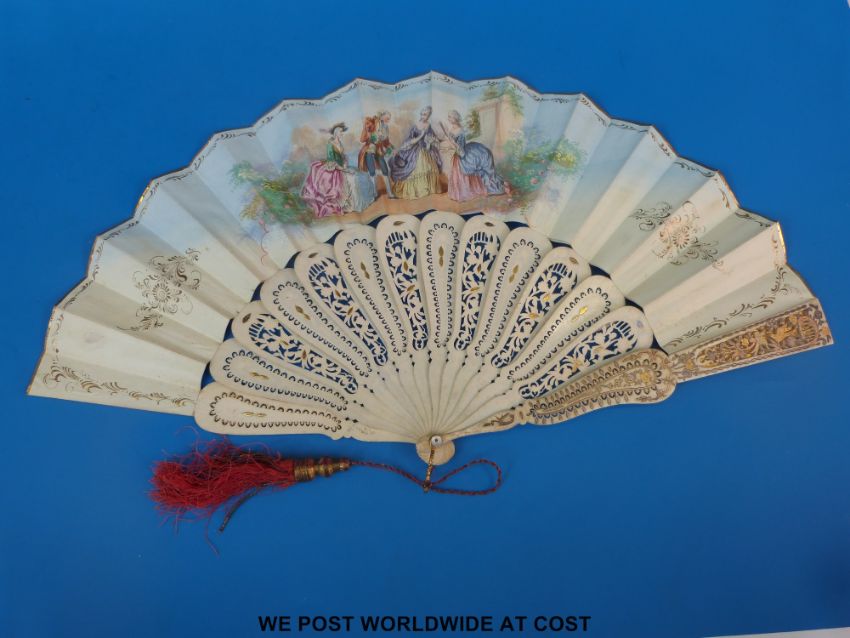 A 19thC pierced and carved bone fan elaborately decorated in gilt with birds in flight and decorated to both sides with Continental court scenes. Gilt metal red tassel to suspension loop, length 27cm
