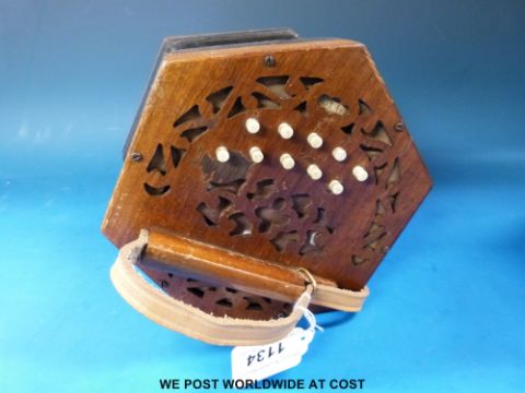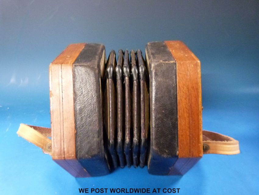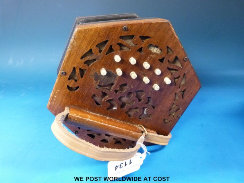A Lachenal & Co Anglo concertina in C/G with 21 bone keys, wooden fret-worked ends, No 155116 (1914) in original metal case