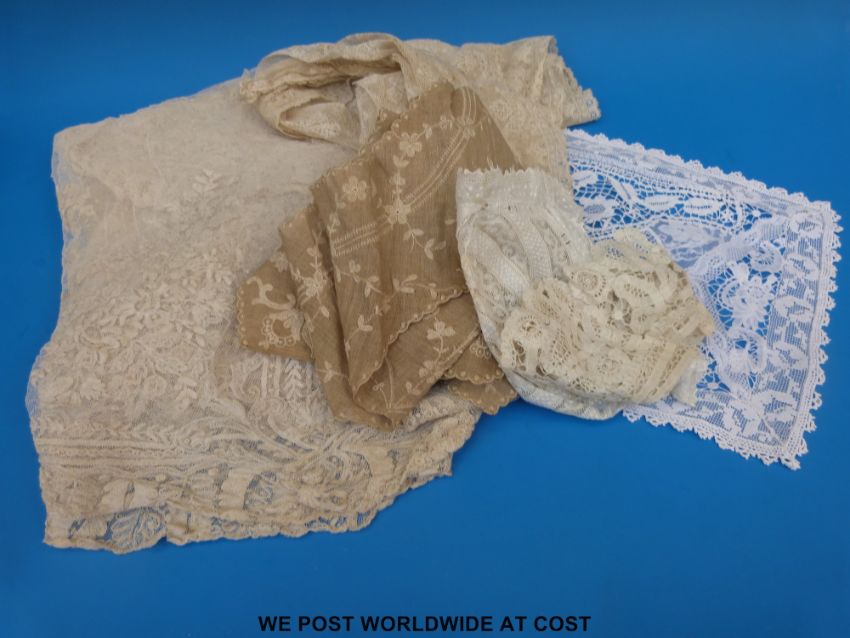A collection of vintage lace, christening gowns, 1920's chiffon tea dress with jacket, polka dot dress, Victorian black dress, lace cape, etc