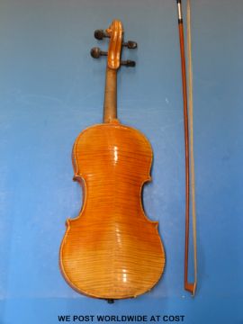 A late 19th early 20thC cased violin with 35cm flamed back, signed inside Matthias Klotz with bow