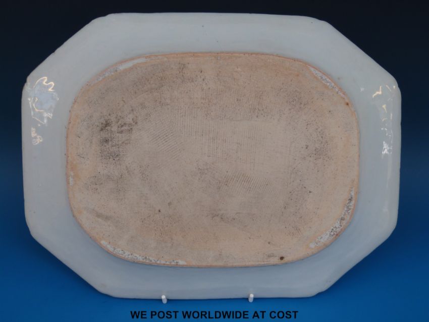 A Chinese octagonal blue and white platter decorated with flowers (35cm x 27cm)