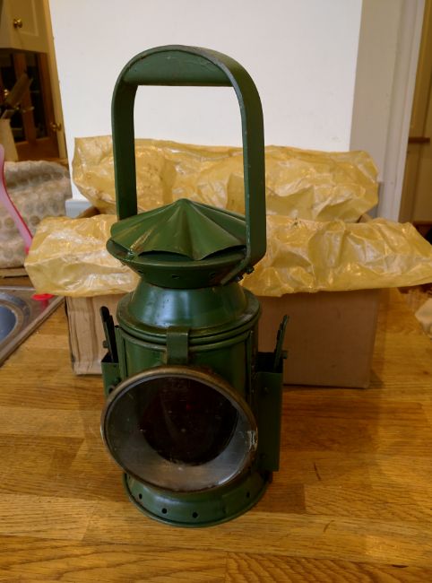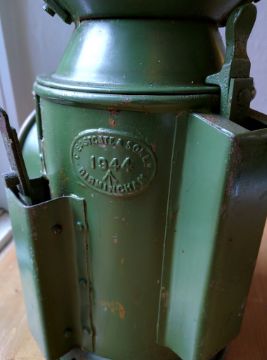 Original 1944 Railway Signal Lantern Lamp. The lamp is unused and in pristine original condition complete with original box and oil skin wrapping. Of military wartime issue, it is in khaki green and has revolving blue and red lenses around the paraffin lamp inside. The lamp bears an oval stamp within which the inscription "C EASTGATE & SON LTD 1944 BIRMINGHAM" plus the military arrow. Including handle, the circular lamp is approx 12.5" high with a diameter of 5" at its widest point