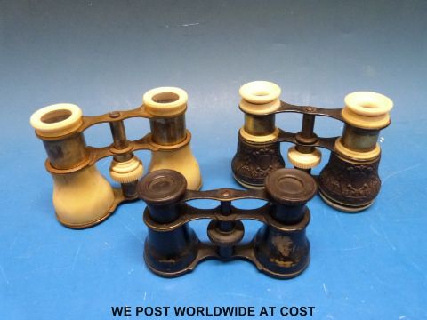 Three sets of ivory and other opera glasses, hip flasks and a hallmarked silver gilt Conservative Club medallion