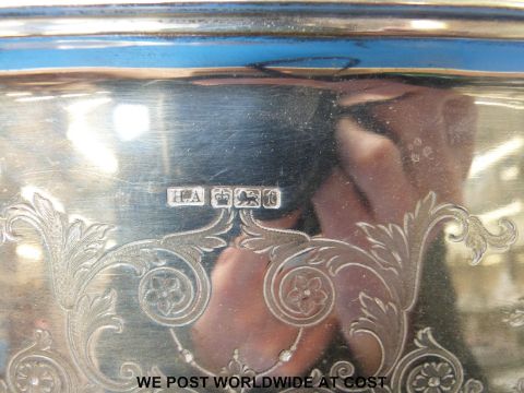 A George V hallmarked silver two handled tray with shaped edge and engraved foliate design raised on four squat feet, inscription to centre relating to the Winchcombe Shire Horse Society 1919. Sheffield 1911, maker Atkin Brothers, (width 62cm, weight 3160g)