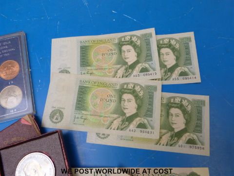 A quantity of sundry coinage, some silver content, modern crowns (including Diana memorial £5 example), crisp £1 notes including consecutive numbers, etc