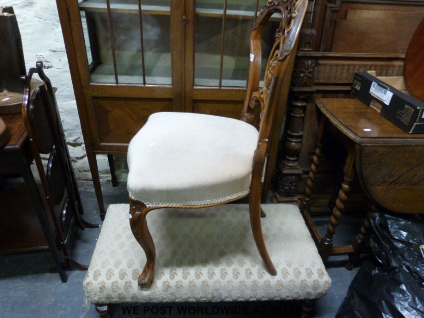 A carved decorated bedroom chair together with a long upholstered foot stool