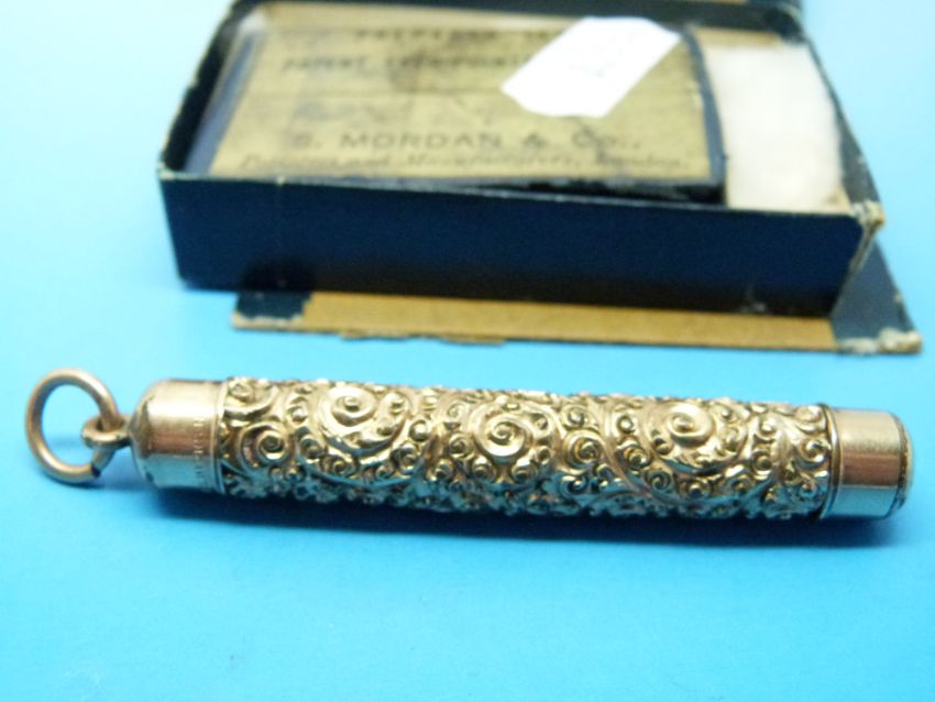 A gold plated pencil by W.S. Hicks, New York with a box of lead