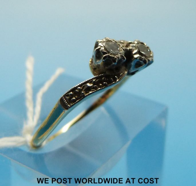 A yellow metal ring marked 18ct gold set with two diamond in a platinum twist setting with diamond encrusted shoulders (size O)