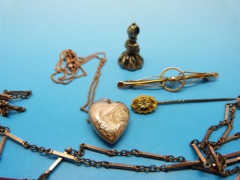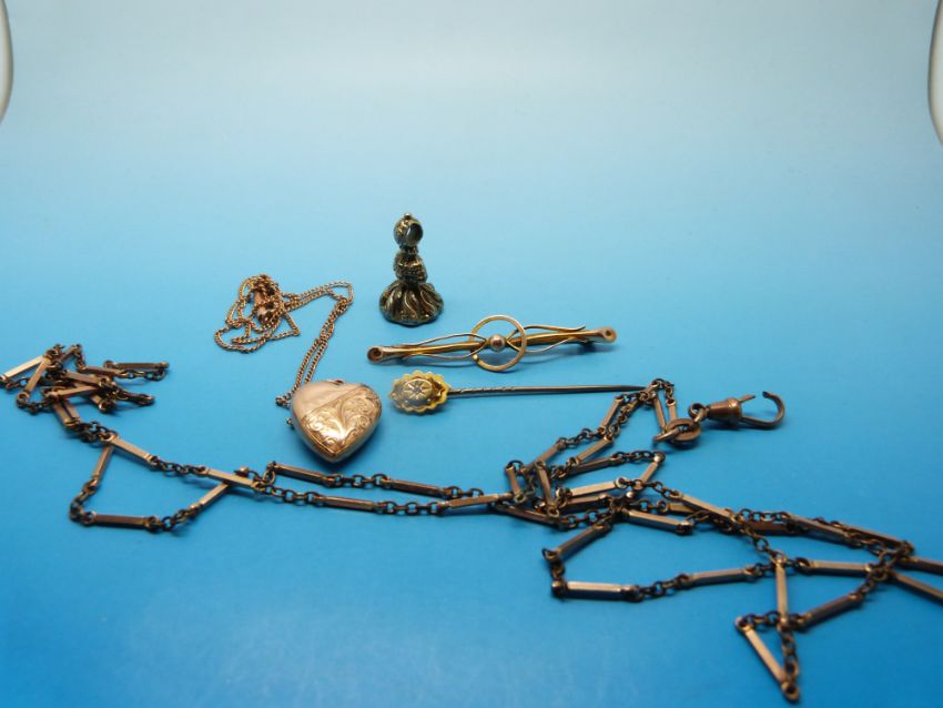 A 9ct gold heart shaped locket, 9ct gold brooch, 15ct gold stick pin, intaglio seal etc