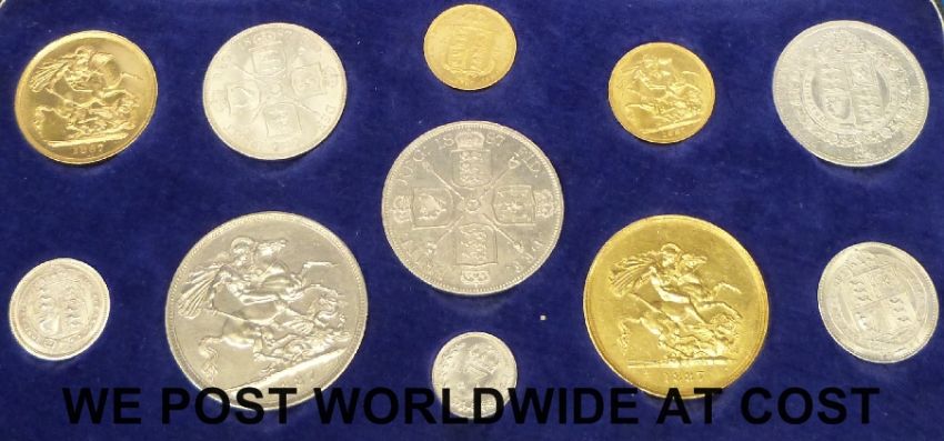 An 1887 gold and silver coin set for Queen Victoria (jubilee head) comprising a gold £5, gold £2, gold sovereign, gold half sovereign, crown, double florin, half crown, florin, shilling, sixpence and threepenny piece, all near uncirculated with case