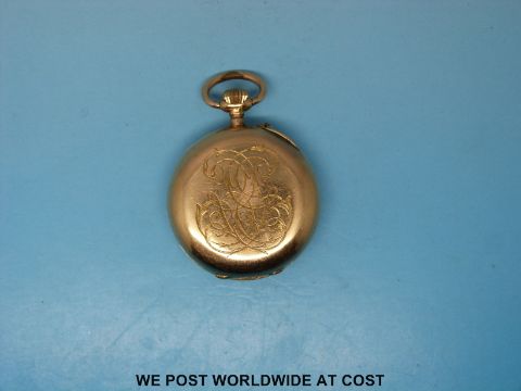 A yellow metal cased keyless fob watch with white enamel dial