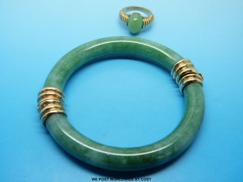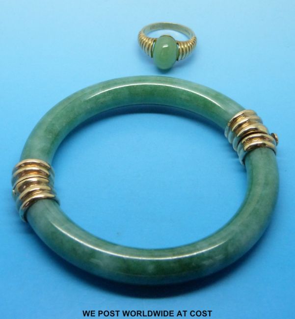 A jade bangle with 9ct gold clasps and a 9ct gold ring set with jade