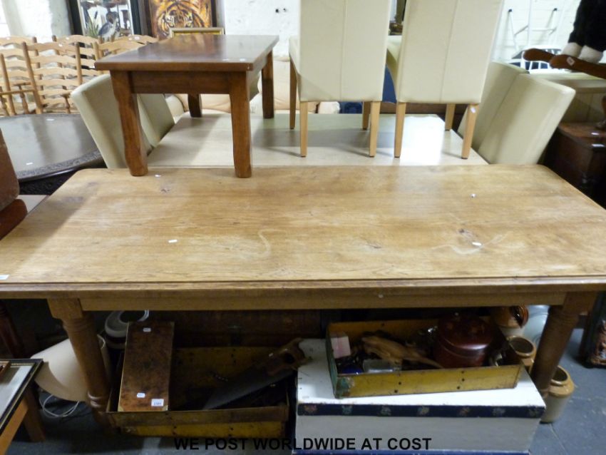 An oak kitchen /dining table raised on turned legs (height 77cm length 215cm width 90cm)