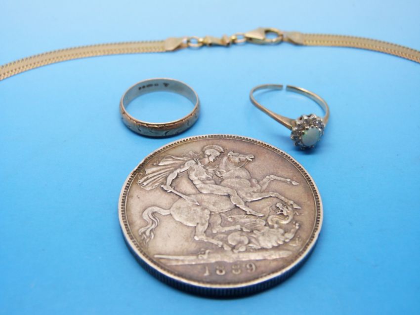 A 9ct gold necklace and ring, an unmarked diamond and opal ring and a Victorian crown
