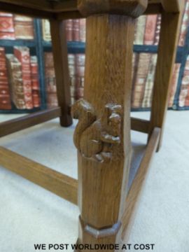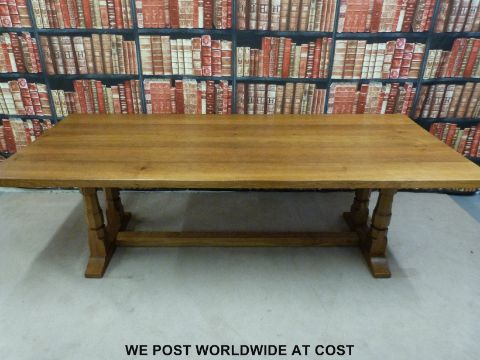 A Wilf 'Squirrelman' Hutchinson adzed oak table and ten upholstered chairs with drop in seats. Hutchinson was a former apprentice of Robert 'Mouseman' Thompson and established his own workshop in 1957 (H76, W241, D105cm)