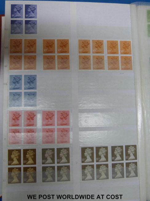 Three part-filled stockbooks of GB Machin stamps and three ring binders of detailed guidance notes for identification