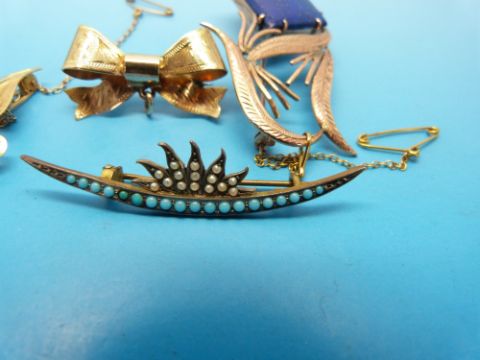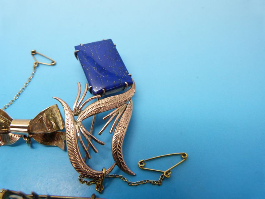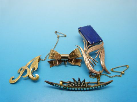 A 9ct gold brooch in the form of a bow, an 18ct gold brooch in the form of a letter "A", a yellow metal and lapis lazuli brooch and another brooch