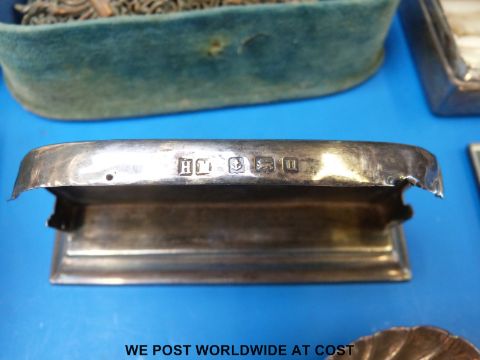 A quantity of hallmarked silver items to include cigarette box, two mirrors, Victorian caddy spoon, spectacle case, sugar tongs, perpetual calendar, retractable multitool etc