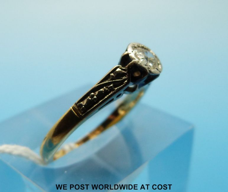 A yellow metal ring marked 18ct set with a round brilliant cut diamond in a platinum setting (size L)