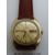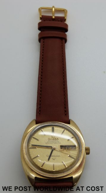 Omega Constellation automatic chronometer gentleman's wristwatch with baton numerals date and day aperture in yellow metal and steel case on brown strap.