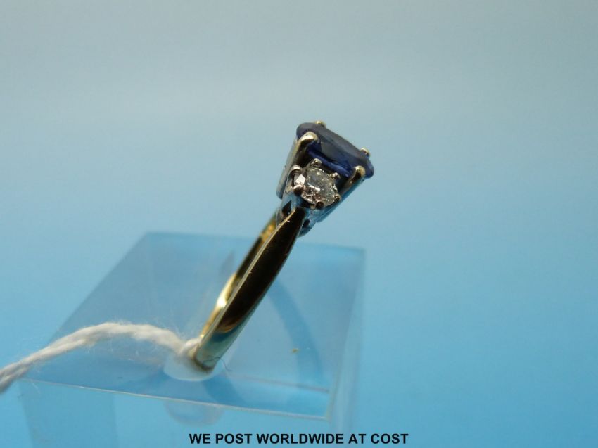 An 18ct gold ring set with an oval tanzanite flanked by diamonds (size L)