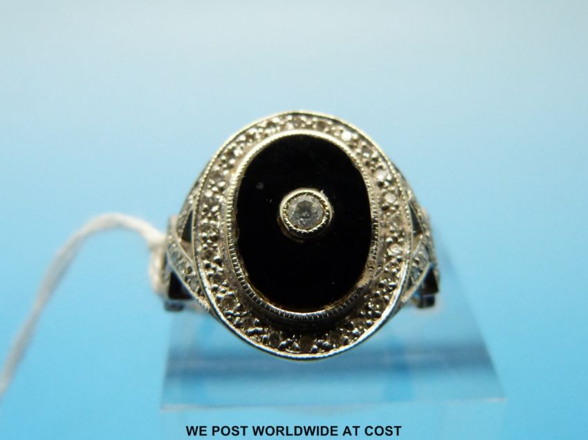 A 9ct white gold ring set with onyx and diamonds (size N)