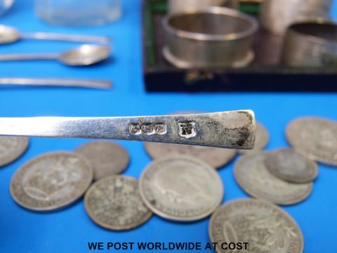 Four various hallmarked silver napkin rings and six hallmarked silver teaspoons, 121g, together with 70g of Victorian and later pre-1947 silver coinage, a silver-topped sugar sifter, a white metal cross and a cased daguerreotype or similar family portrait