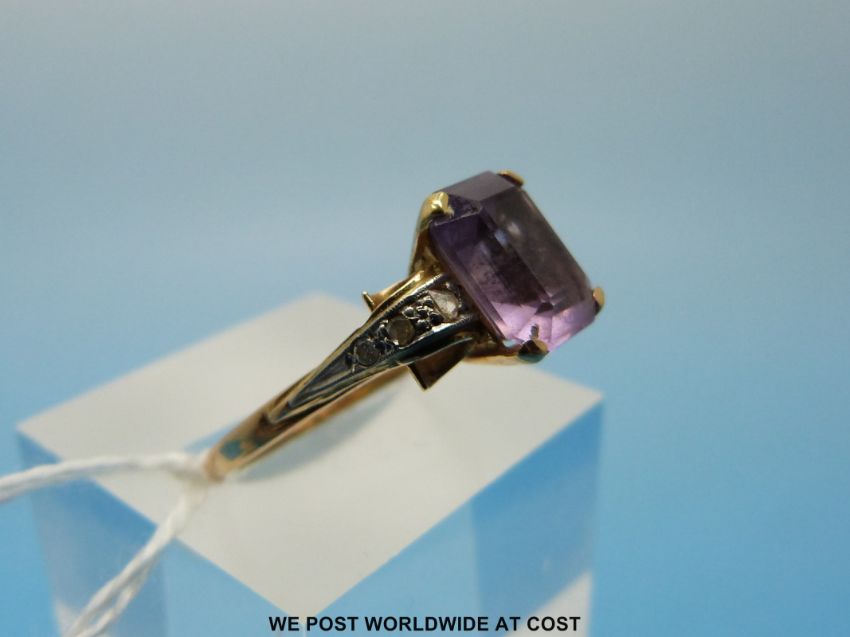 A yellow metal ring set with an emerald cut amethyst and diamonds (size S)