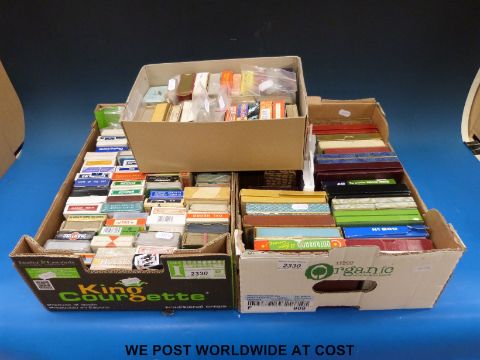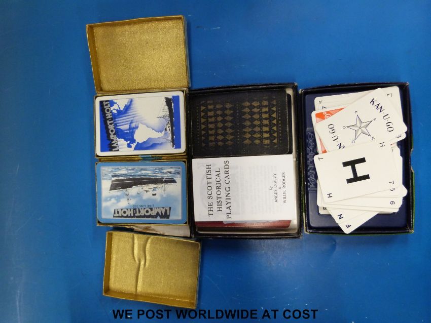 Two boxes of single deck playing cards (approximately 100, including advertising) together with a box of double decks (approximately 25)