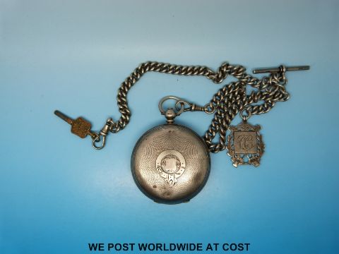H Samuel silver cased gentleman's pocket watch hallmarked Birmingham 1890 on a silver chain with enamelled rifles fob and key 'High Wycombe Corn Market'
