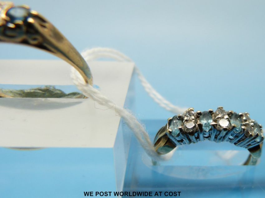 Two 9ct gold rings one set with three blue stones and diamonds and the other set with cubic zirconia and blue stones