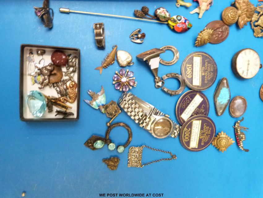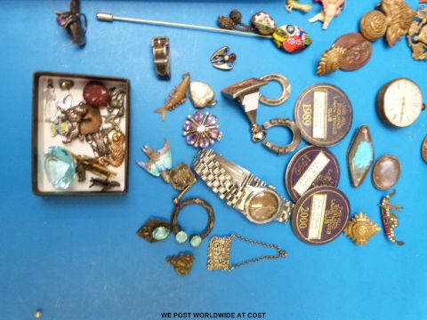 A quantity of costume jewellery to include silver butterfly wing brooches, other silver brooches, millefiori pin, silver buckle clip and yellow metal framed intaglio seal together with military badges etc