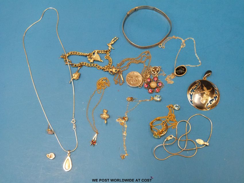 A 9ct gold necklace with pendant together with silver and white metal jewellery