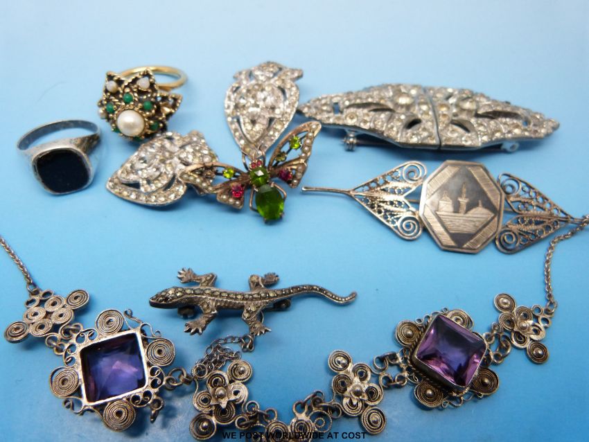 A silver filigree necklace set with amethysts and a cameo, white metal brooch, silver lizard brooch, paste metamorphic brooch, ring etc