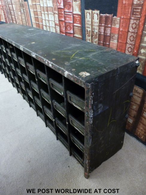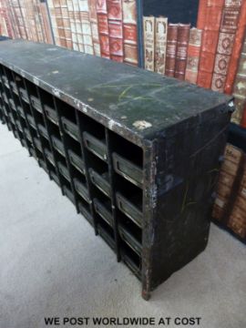 A vintage set of shopfitting / haberdashery / engineer's metal cubby holes with brass ticket pockets, 44 sections (w130 x d22 x h44cm)