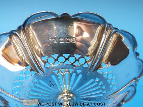 An Edwardian hallmarked silver sweet meat dish formed as a tripod table with pierced top, Sheffield 1908, maker Roberts & Belk, stamped Rd531857 (height 9cm, diameter 12cm, 91g)