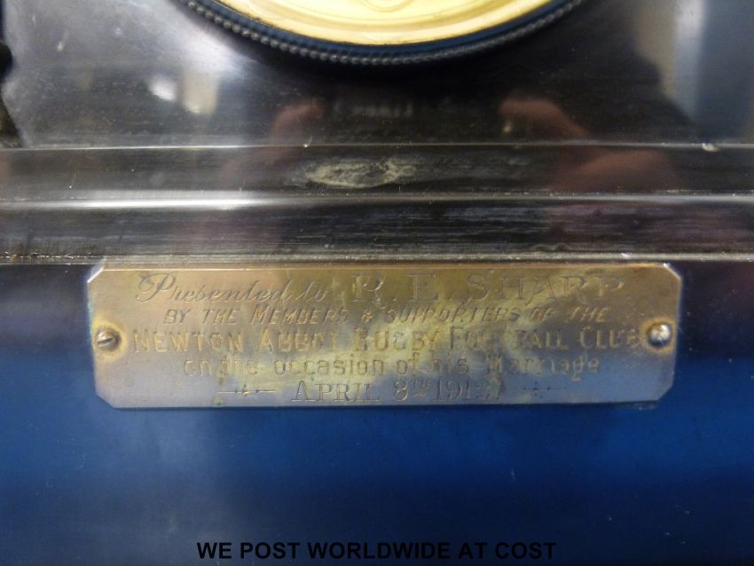 A French mantel clock by Samuel Morte, striking on a gong, with plaque to front "Presented by Newton Abbot Football Club 1912"