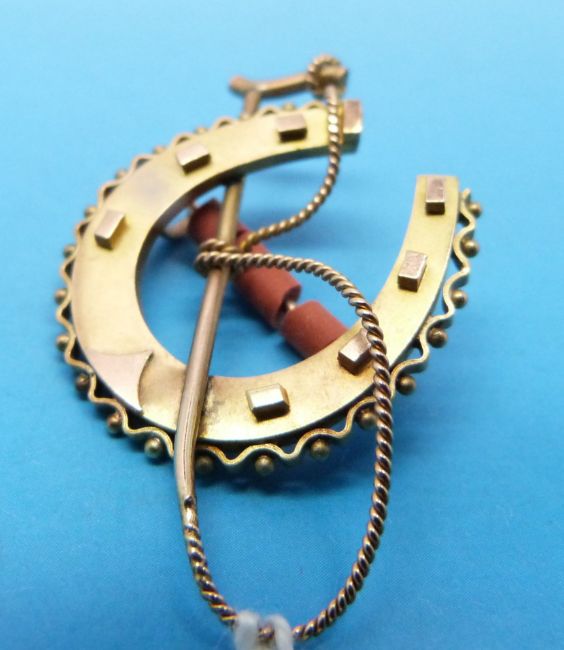 A gold horseshoe and whip brooch