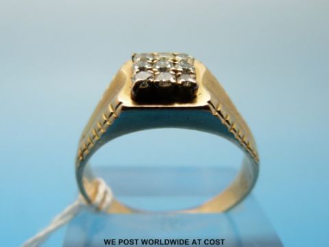A gold ring set with nine diamonds in a square setting (size V)