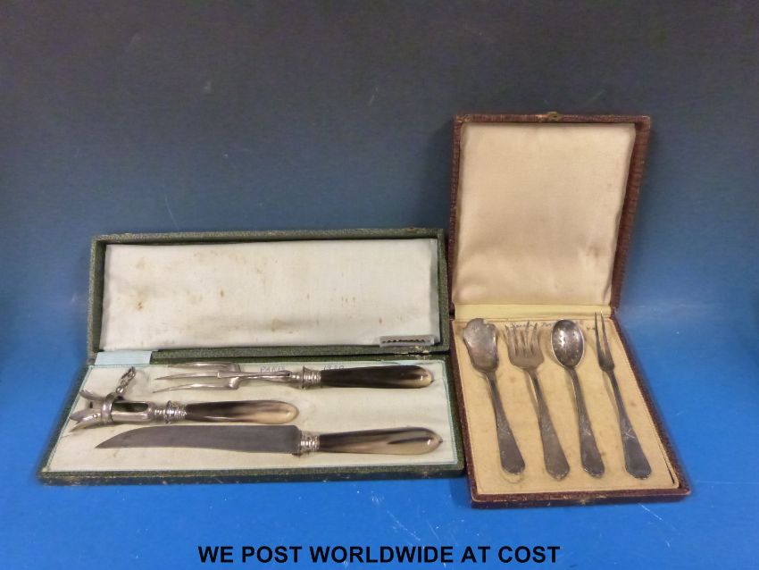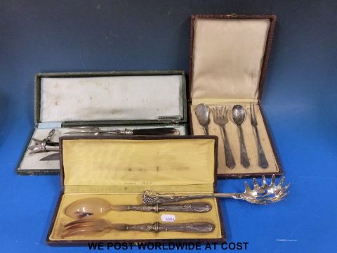 A cased pair of salad servers with white metal handles together with a carved carving set and a further cased serving set