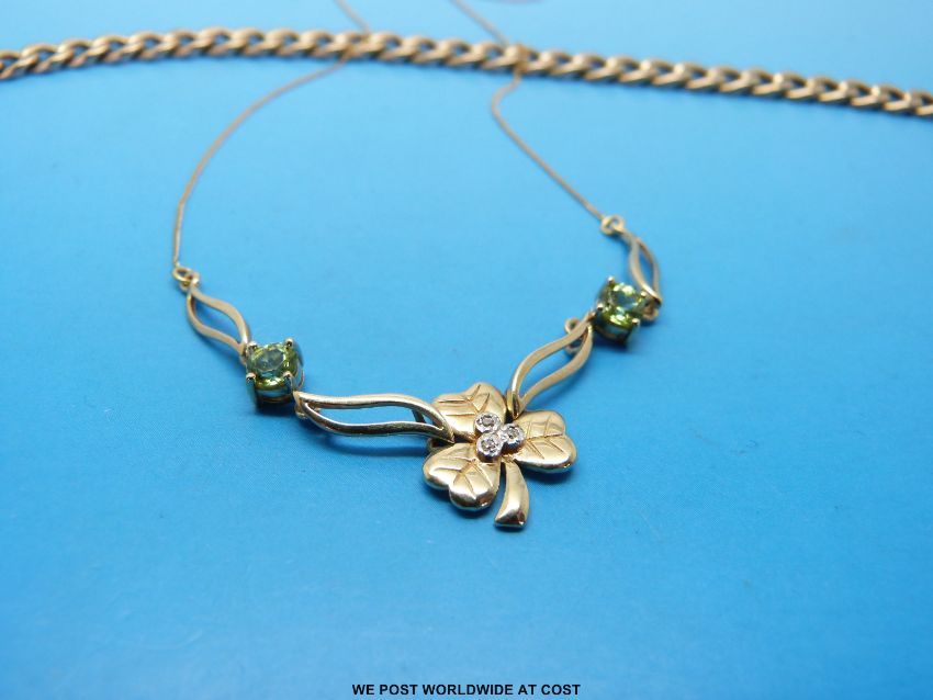 A 9ct gold necklace with clover pendant set with diamond and peridots and a 9ct gold bracelet