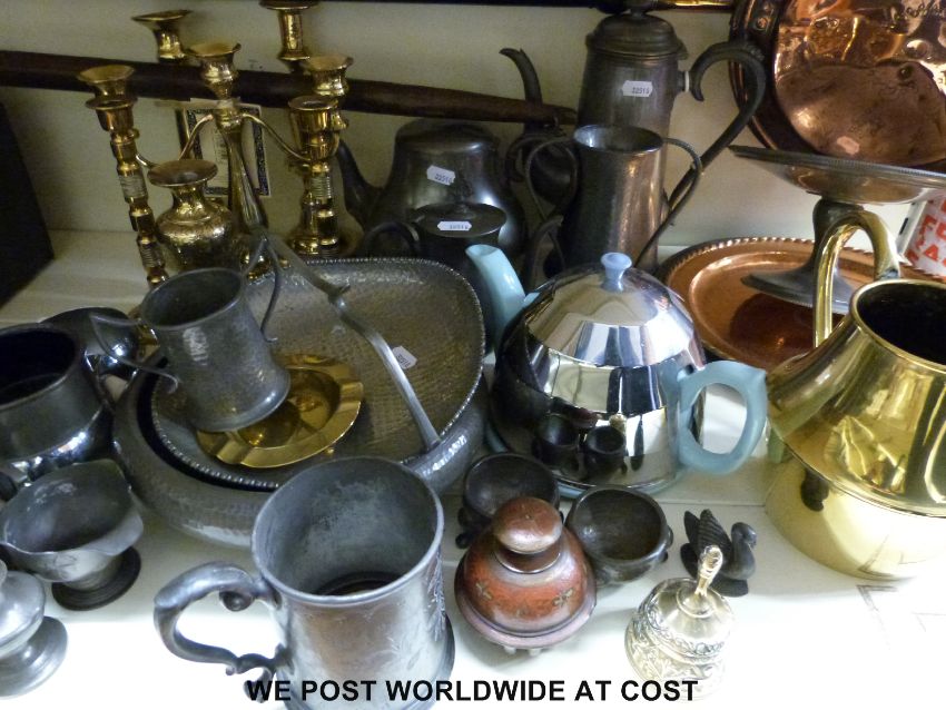 A quantity of metalware to including brass, plated ware, pewter including Art Nouveau, ejector etc