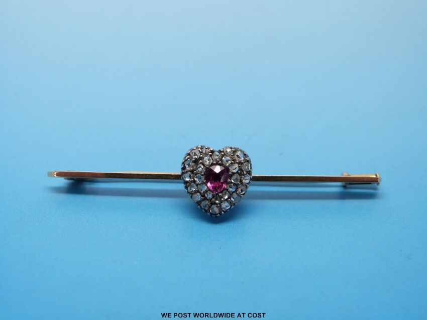 A gold brooch set with rose cut diamonds and a central old cut ruby in a heart shape