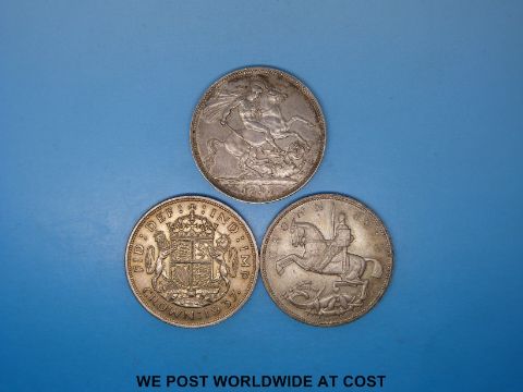 An 1887 Victorian jubilee head crown together with a 1935 rocking horse crown and a 1937 George VI example